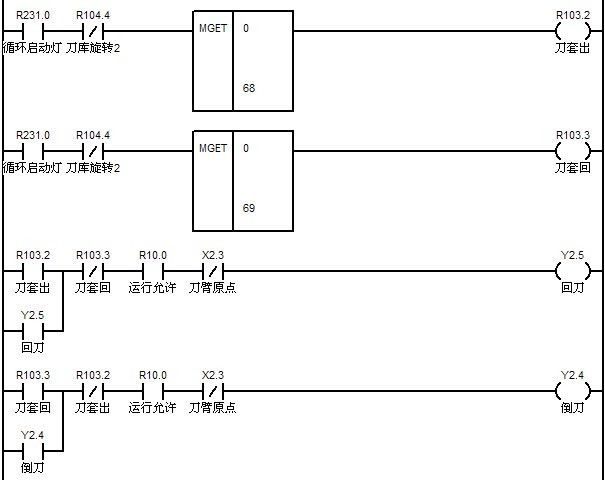 ????? M34的實現與M33類似,通過檢查F寄存器0組第8,9,10,11位可以檢查預設定的機床第二,三,四,五參考點。另外也可以根據需要寫出相似的代碼用來檢查每個運動軸的參考點。