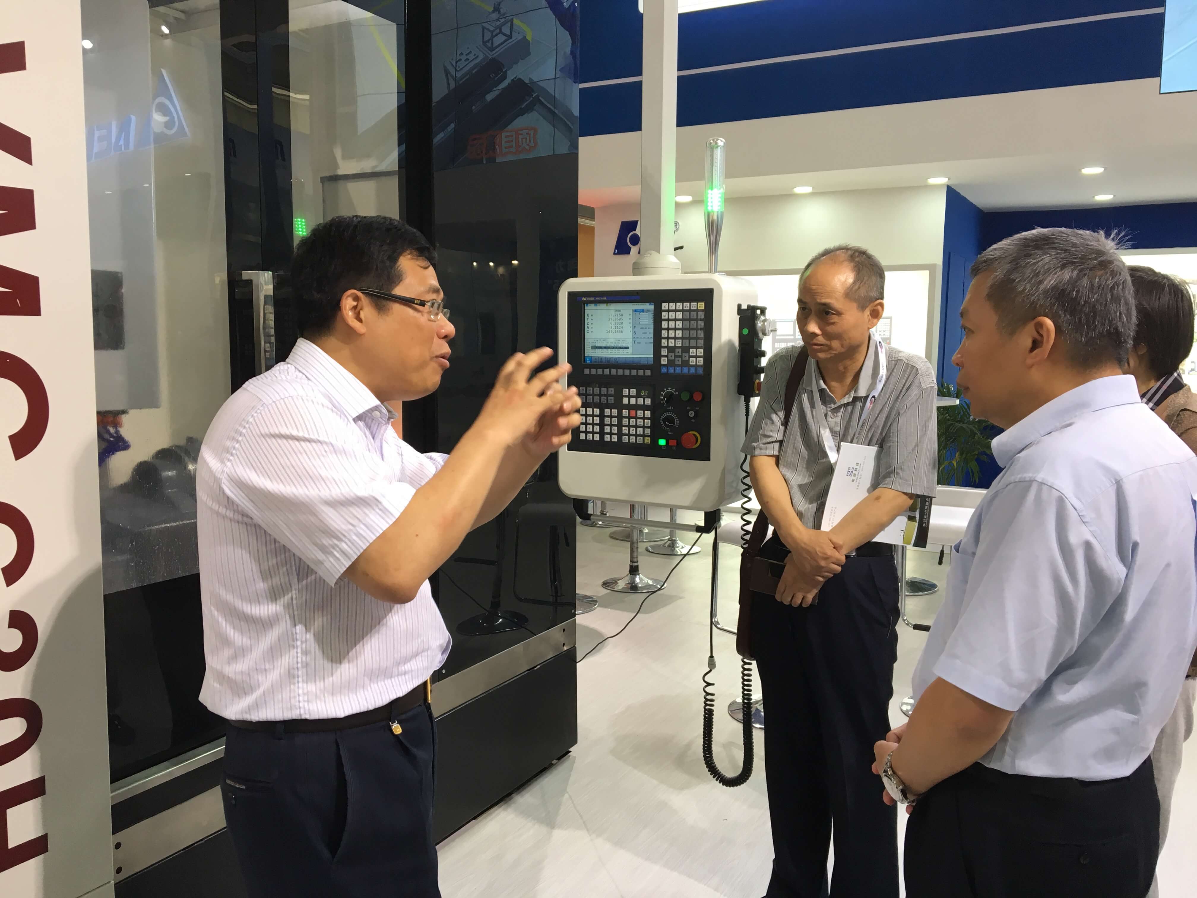 華中數控董事長陳吉紅為來訪嘉賓介紹五軸數控系統