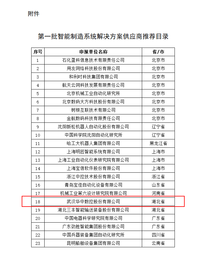 華中數控正式入選工信部《第一批智能制造系統解決方案供應商推薦目錄》