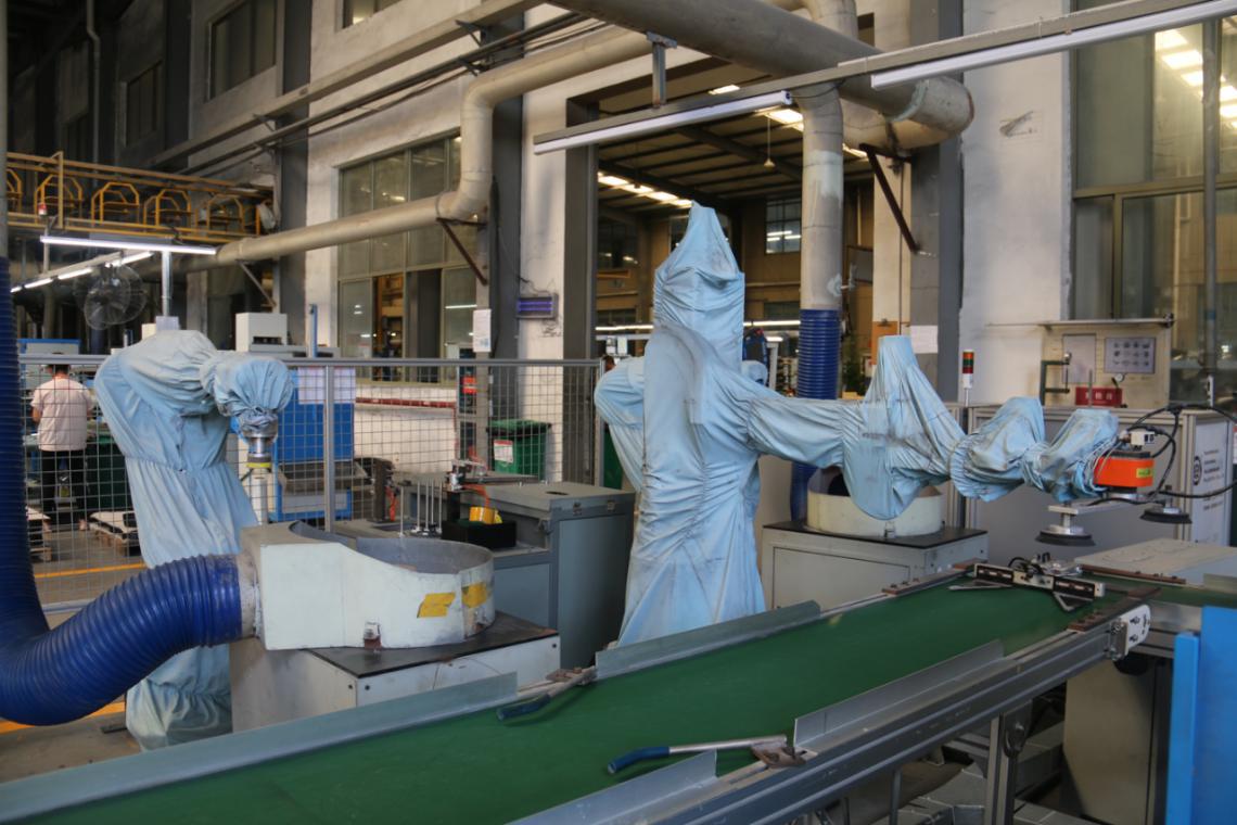 走近仔細一看,原來這些神秘俠客是一臺臺穿著防塵服的華數機器人,它們的主要工作是機器人打磨和機床上下料。