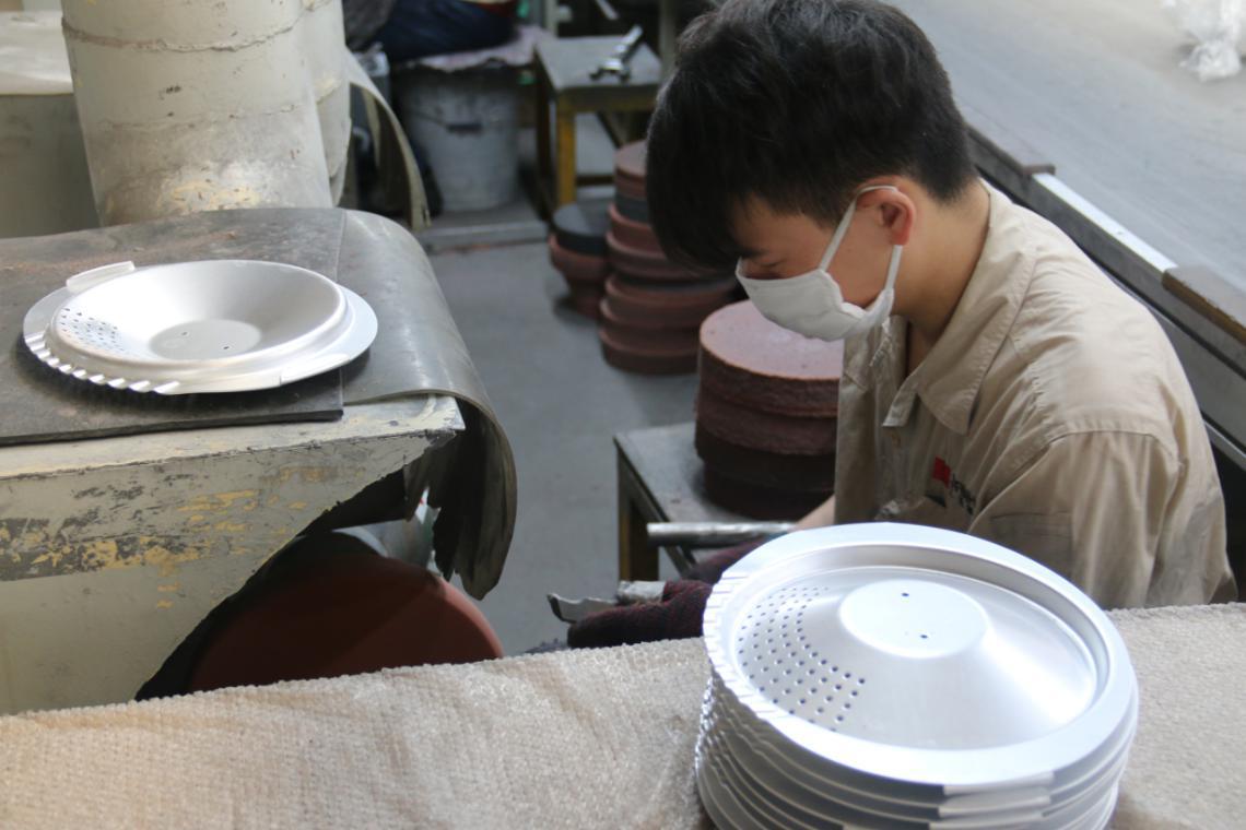鍋具打磨以前是靠工人一件件的手工打磨,粉塵多,噪音高,勞動環境非常惡劣,你看那位坐在角落里的小哥哥了嗎,他正在給鍋具打磨,給他點贊,但同時也替他擔心。