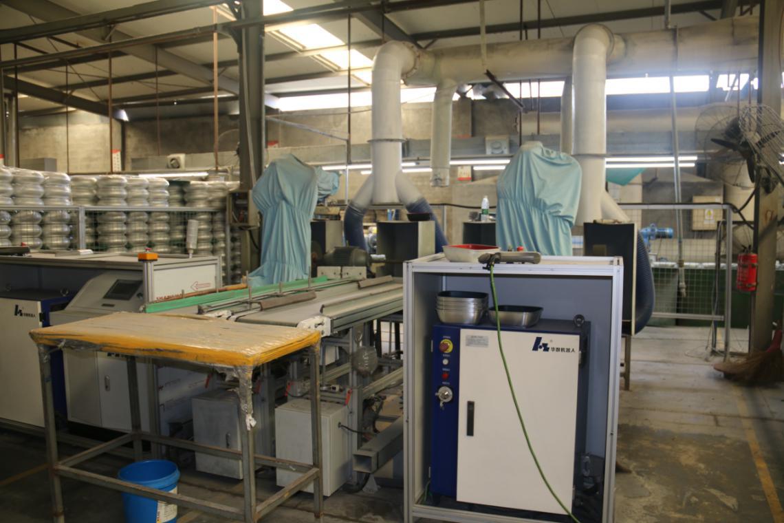 浙江三禾廚具是一家專業致力于中高端廚房用品的于科研、生產、銷售與服務一體化的浙江省明星企業。公司現有職工1200余名,年生產能力達2400萬只以上。擁有全自動的拉伸、噴涂、裝配等生產線,具有雄厚的技術力量和精優的加工設備。三禾廚具從2016開始與寧波華數機器人開展合作,主要是使用華數機器人自動化生產線,代替人工進行鍋具的打磨和上下料。