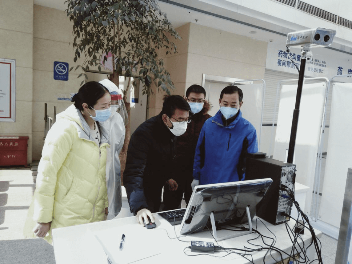 工程師在醫(yī)院現(xiàn)場(chǎng)安裝調(diào)試“紅外智能體溫檢測(cè)系統(tǒng)”