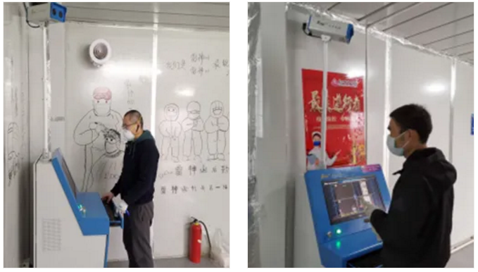 3月9日上午,華中數控數控系統事業部副總經理岳應超、專項技術支持部副部長尹樂等同事,緊急趕赴雷神山醫院現場,分別在醫院A區、C區醫護通道出入口,以及醫護人員辦公區三處地點,迅速安裝華中數控“HY2005B紅外熱成像智能體溫檢測系統”,馬上投入設備安裝調試、培訓操作方法等工作,通過對醫護人員的體溫監測,嚴格檢查健康狀況,避免人員接觸造成交叉感染。
