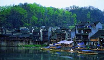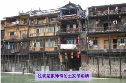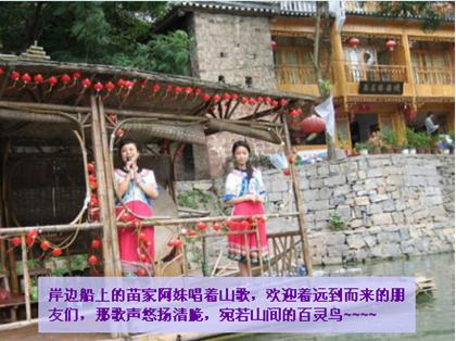 那湘人深諳經商之道,怕我們泛舟枯燥影響雅興,居然在江中設一對歌臺于龍舟上。舟上眾多美女著民族服飾不斷唱山歌輪番“挑逗”游客,我們一激動便讓船老板教我們和起了山歌。那時候什么斯文形象、什么旅途疲憊、什么時間觀念,哈哈!統統地拋在腦后。到得岸邊,一行人樂呵呵都說不虛此行!以至于回到故鄉N日了,鳳凰古城那碧綠的江水、江中暢游的漁舟、江畔吊腳樓的裊裊輕煙,以及兩岸浣紗山姑的朗朗笑聲,就像蒙太奇似地總是在腦海里不斷疊現……