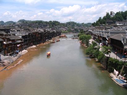 據導游介紹,在鳳凰城登高眺望,除古色古香的古建筑外,還可欣賞“鳳凰古八景”:東嶺迎暉、南華疊翠、奇峰挺秀、溪橋夜月、龍潭漁火、梵閣回濤、山寺晨鐘、蘭徑樵歌。近年新推出的“鳳凰新八景”,包括沙灣沈從文故居、東門城樓、北門碼頭、沱江泛舟、虹橋藝術樓、熊希齡故居、楊家祠堂、萬壽宮、崇德堂等如今也成為游客選擇的熱門的新旅游項目。我們一行人便迫不及待地參與泛舟沱水賞景。真是人在江湖身不由己,我們泛舟江中,經不住誘惑,不經意間進入人家的“圈套”,實實在在地為其他游客做了一回“道具”一抹“風景”。