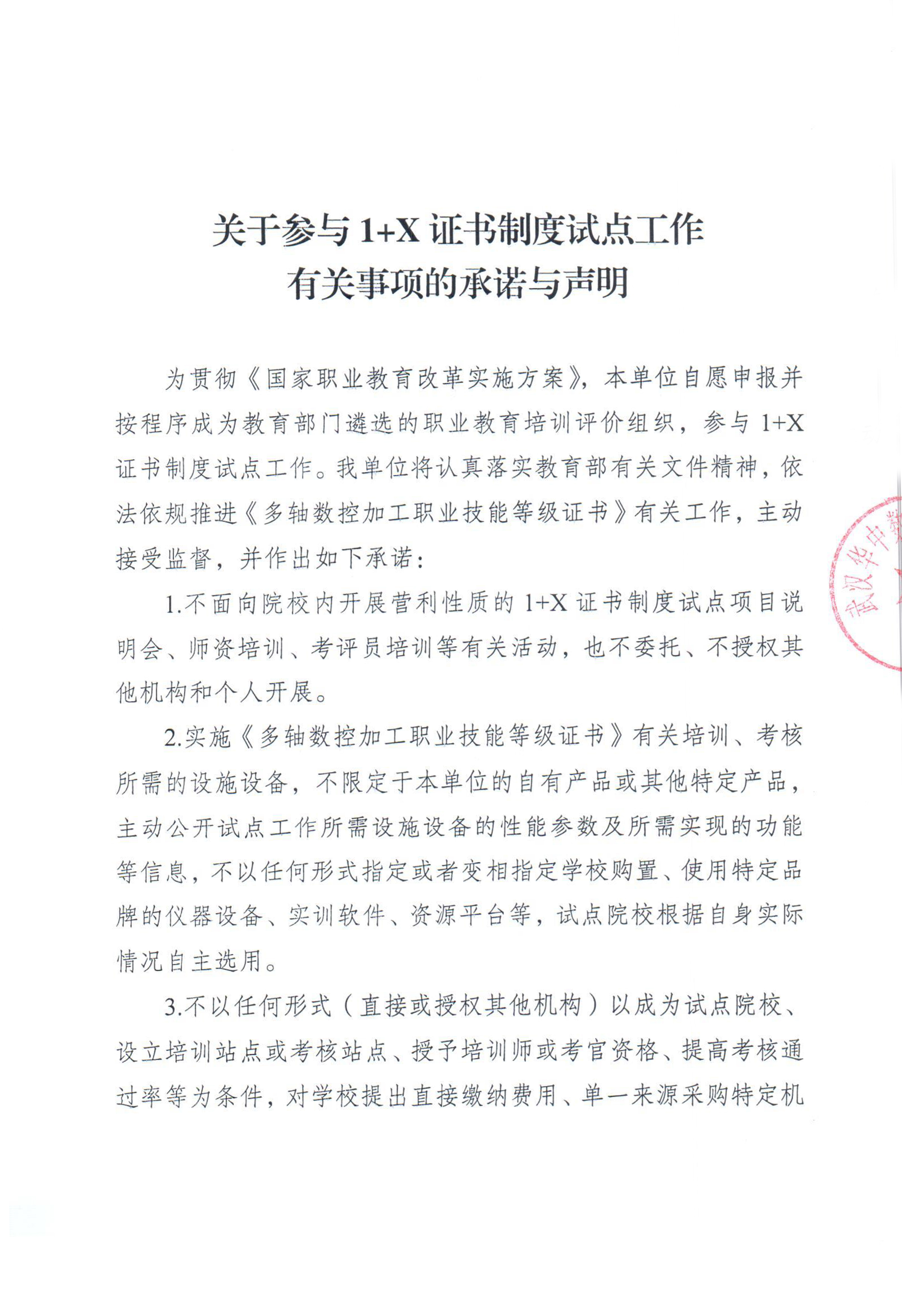 關(guān)于參與1+X證書(shū)制度試點(diǎn)工作有關(guān)事項(xiàng)的承諾與聲明