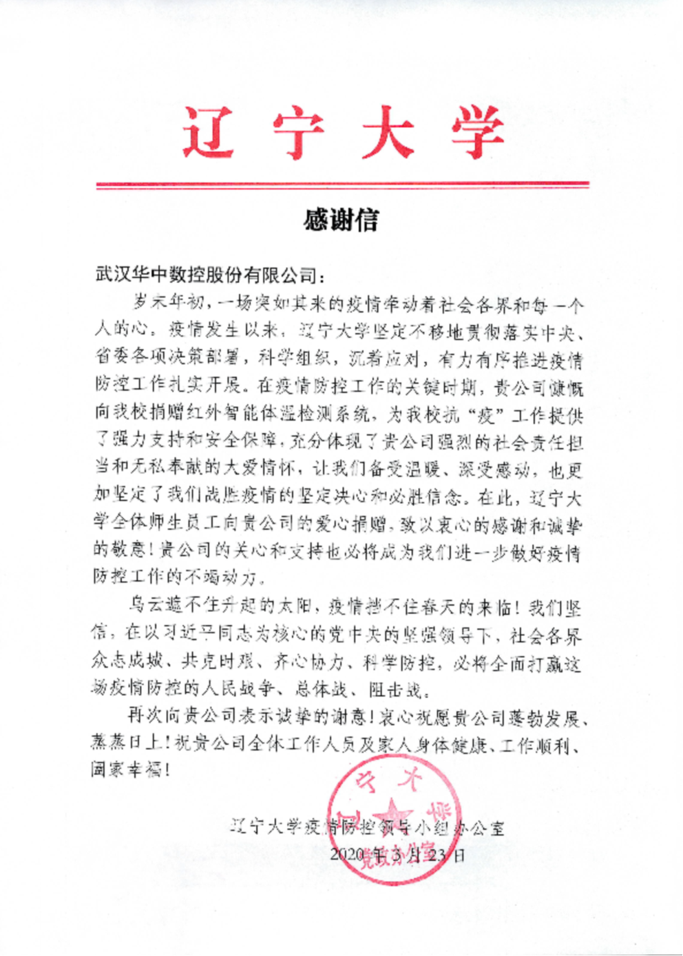 國務院點名表揚!國務院聯防聯控機制給華中數控發來感謝信